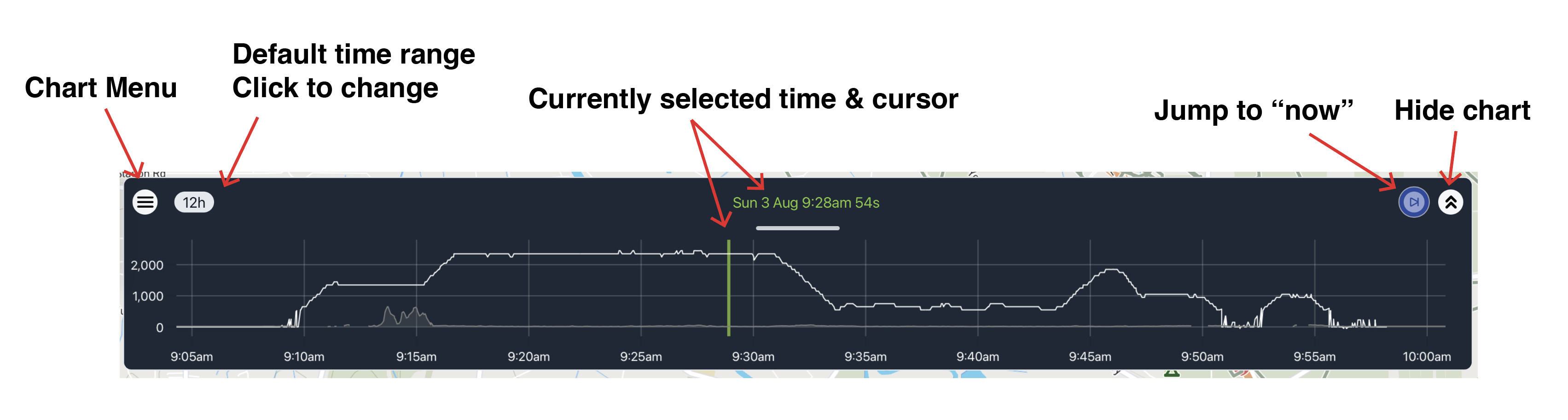 Selecting a point on the chart will pause the PureTrack map. The currently selected time will appear at the top center of the map, and in green on the chart. Blue buttons appear to go back to live view or 'now'.