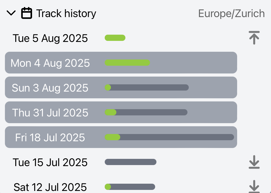 Green bar indicates data is available to view. Grey bar is OGN data that is no longer available. The size of the bar indicates how mant data points each day has relative to the other days.