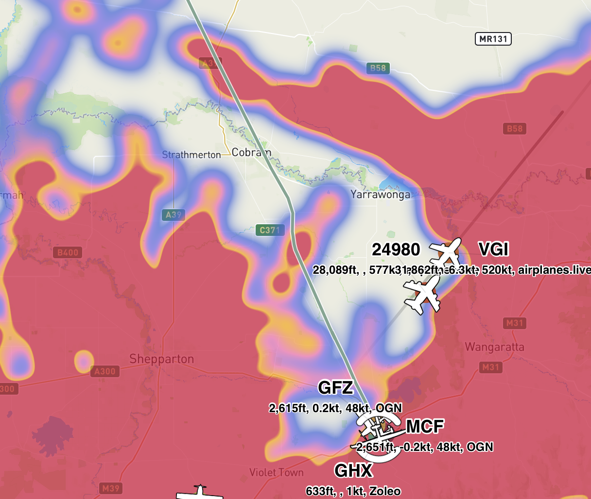 Now pulling data from airplanes.live, worldwide, every 5 seconds. See our ADSB page on how to help feed ADSB data with your own receiver.