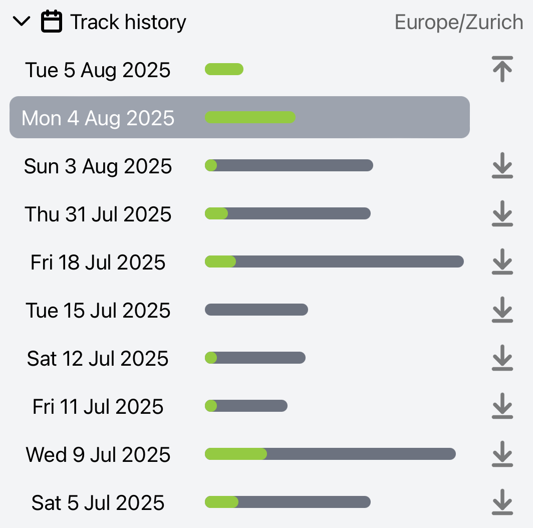 View a list of days with tracking data for any map marker. Click any day to view that day's tracks. You can also select multiple days.