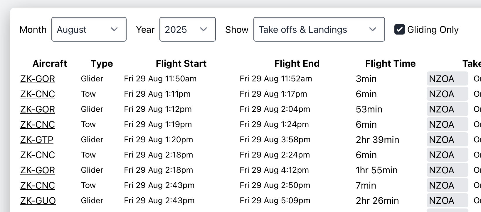 View a list of all take offs and landings at your airfield for any month of the year. Option to download as CSV. Also an option to filter to only gliders and tow planes. Currently all Pro users can view these while we develop and test this feature.